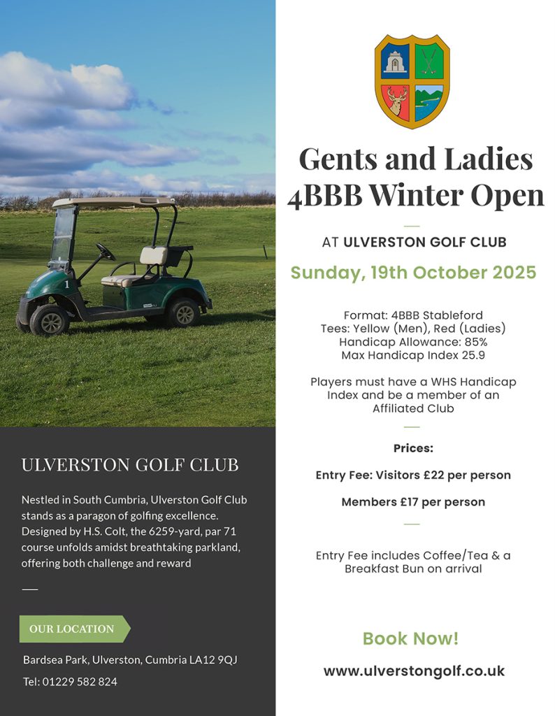 If you would like to book this event, please email us on enquiries@ulverstongolf.co.uk or call 01229 582824.
